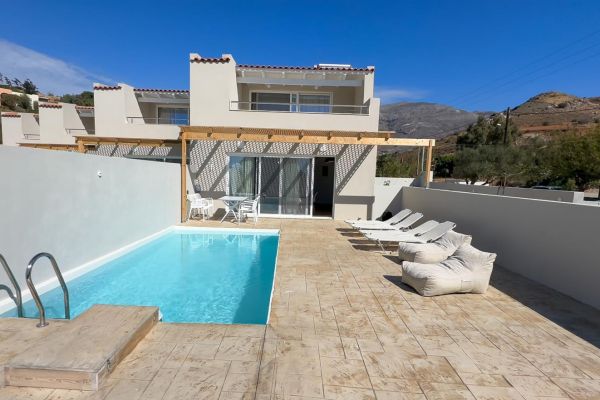 Das neuwertige Chalet Bluemüto 4 verfügt über einen eigenen Pool mit Terrassenmöbeln und Garten. Es ist nur ca. 190 m vom Strand entfernt. Das Haus verfügt im Erdgeschoss über einen Wohn-Essbereich mit einer offenen Küche, ein Doppelschlafzimmer mit Bad ensuite. Im Obergeschoss befindet sich das 2. Doppelschlafzimmer mit ebenfalls einem Bad ensuite, sowie eine Balkonterrasse mit Blick auf die Poolterrasse bis zum Meer. WLAN, Sat-TV, Klimaanlage sind vorhanden. Ein Parkplatz befindet sich auf dem Grundstück. Ideal für Familien und Gäste, die nur einen kurzen Weg zum Strand mit entsprechenden Tavernen vor Ort bevorzugen. Zum Touristenort Plakias, mit zahlreichen Einkaufsmöglichkeiten, sind es nur ca. 3 km.