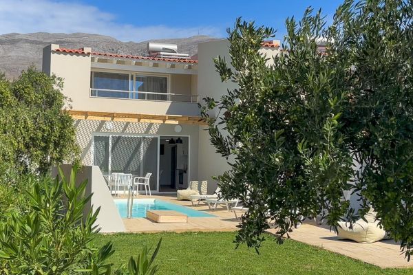 Das neuwertige Chalet Bluemüto 7 verfügt über einen eigenen Pool mit Terrassenmöbeln und Garten. Es ist nur ca.1 90 m vom Strand entfernt. Das Haus verfügt im Erdgeschoss über einen Wohn-Essbereich mit einer offenen Küche, ein Doppelschlafzimmer mit Bad ensuite. Im Obergeschoss befindet sich das 2. Doppelschlafzimmer mit ebenfalls einem Bad ensuite, sowie eine Balkonterrasse mit Blick auf die Poolterrasse bis zum Meer. WLAN, Sat-TV, Klimaanlage sind vorhanden. Ein Parkplatz befindet sich auf dem Grundstück. Ideal für Familien und Gäste, die nur einen kurzen Weg zum Strand mit entsprechenden Tavernen vor Ort bevorzugen. Zum Touristenort Plakias, mit zahlreichen Einkaufsmöglichkeiten, sind es nur ca. 3 km.