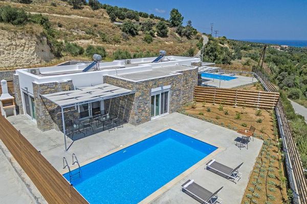 Video ansehen? Einfach auf Google/YouTube eingeben: 'Ferienhäuser Kolossos Kreta'. Die kleine Villenanlage, mit 4 Einheiten, befindet sich in ruhiger, reizvoller, hügeliger Umgebung mit Blick auf die Berge bis hinunter zum Meer. Die modernen gemütlichen Ferienhäuser verfügen jeweils über einen Wohn-Essbereich, 2 Doppelschlafzimmer und 2 Bäder. Vom Wohnbereich und von einem Schlafzimmer betritt man die große Terrasse mit Blick auf den sichtgeschützten Garten und den großen Pool. Die Häuser sind alle gleich eingerichtet. Die Anlage liegt unweit zwischen den Orten Mesi und Agia Triada im Bezirk Rethymnon. Die nächste kleine Taverne ist gut zu Fuß in wenigen Minuten erreichbar im malerischen Ort Mesi. Die Häuser sind klimatisiert und verfügen jeweils über eine Waschmaschine, Mikrowelle, Herd, Bügeleisen und Kühlschrank. WLAN ist vorhanden. Auf der Terrasse befindet sich ein gemauerter BBQ-Grill. Die Umgebung eignet sich gut für Wanderungen durch Olivenhaine, bis zum ca. 5,5 km entfernten Strand. Retymnon (ca. 9 km entfernt), mit seiner venezianischen Altstadt, erreicht man mit dem Auto in wenigen Minuten. Dort befinden sich unzählige Restaurants, Cafés und Einkaufsmöglichkeiten und der lange Ortsstrand.