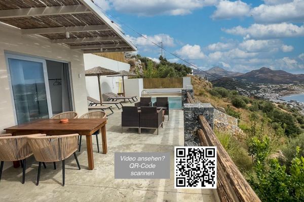 Die Villa hat durch die Außenlage und die große Dachterrasse mit BBQ einen einzigartigen Panoramablick über die Bucht von Plakias. Die Villa ist wie die modern und komfortabel eingerichtet. Die große Poolterrasse bietet genügend Platz für Liegestühle und Terrassenmöbel. Das Haus verfügt über 1 Wohn-Essraum mit offener Küche, 2 Bäder und 2 Doppelschlafzimmer mit fantastischem Meerblick. Die Poolterrasse ist von beiden Schlafzimmern und vom Wohnbereich begehbar. Die Dachterrasse verfügt über eine teilweise überdachte Sitzecke mit BBQ-Grill. Zum nahen Touristenort Plakias sind es nur wenige Autominuten. Dort befinden sich Einkaufsmöglichkeiten, Cafés und Restaurants sowie ein langer bewirtschafteter Sandstrand.