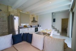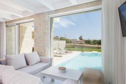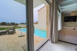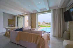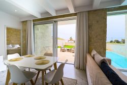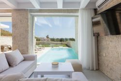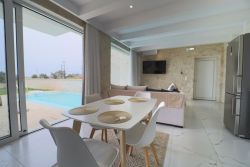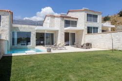 Das Chalet ist eines von 3 gleich eingerichteten neuerbauten Ferienhäusern mit Garten und eigenem Pool mit Liegen und Gartenmöbeln. Es ist nur ca. 80 m vom Sandstrand von Damnoni entfernt. Das Haus verfügt im Erdgeschoss über einen Wohn-Essbereich mit offener Küche und ein Doppelschlafzimmer mit Bad ensuite und Zugang zur Terrasse. Im Obergeschoss befindet sich das 2. Doppelschlafzimmer, ebenfalls mit einem Bad ensuite sowie Zugang zur Dachterrasse mit Blick zum Meer. Das Chalet verfügt über WLAN, TV, Netflix, Waschmaschine und A/C-Klimaanlage. Es wird mehrmals pro Woche gereinigt.