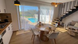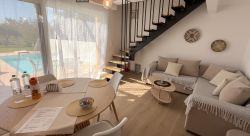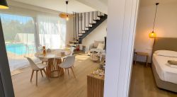 Das neuwertige Chalet Bluemüto 4 verfügt über einen eigenen Pool mit Terrassenmöbeln und Garten. Es ist nur ca. 190 m vom Strand entfernt. Das Haus verfügt im Erdgeschoss über einen Wohn-Essbereich mit einer offenen Küche, ein Doppelschlafzimmer mit Bad ensuite. Im Obergeschoss befindet sich das 2. Doppelschlafzimmer mit ebenfalls einem Bad ensuite, sowie eine Balkonterrasse mit Blick auf die Poolterrasse bis zum Meer. WLAN, Sat-TV, Klimaanlage sind vorhanden. Ein Parkplatz befindet sich auf dem Grundstück. Ideal für Familien und Gäste, die nur einen kurzen Weg zum Strand mit entsprechenden Tavernen vor Ort bevorzugen. Zum Touristenort Plakias, mit zahlreichen Einkaufsmöglichkeiten, sind es nur ca. 3 km.