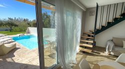 Nur ca. 190 m vom Sandstrand entfernt, genießen Sie hier Ruhe und zugleich die Nähe zum Meer. Im Erdgeschoss erwartet Sie ein heller Wohn- und Essbereich mit offener, voll ausgestatteter Küche, ein gemütliches Doppelschlafzimmer mit Bad en suite. Das Obergeschoss beherbergt ein zweites Doppelschlafzimmer, ebenfalls mit eigenem Bad, sowie eine Balkonterrasse mit herrlichem Blick auf die Poolterrasse und das Meer. Zur Ausstattung gehören selbstverständlich WLAN, Sat-TV und Klimaanlage.