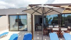 Vom Wohnbereich gelangt man ebenfalls auf die überdachte Terrasse und zum Pool. Dort lässt sich die exzellente Aussicht auf das Meer besonders gut genießen.