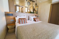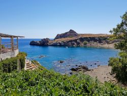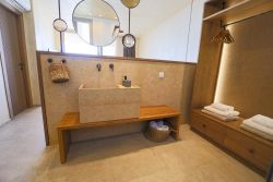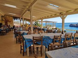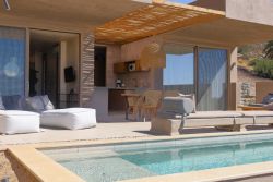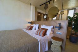 Hier finden Gäste ungestörte Plätze zwischen Felsen und Küstenformationen — perfekt zum Entspannen und Genießen. Zwei bewirtschaftete Strände mit Service, Sonnenschirmen und Liegen befinden in ca 2,5 km entfernt.. Dort gibt es 2 Tavernen, einschließlich Café und ein Minimarkt. Jede Terra Premium Villa verfügt über ein Doppelschlafzimmer mit integriertem Bad sowie einen Wohnbereich mit zwei komfortablen Schlafsofa.