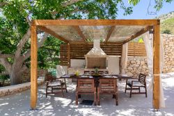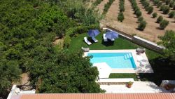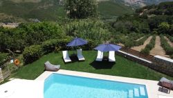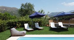 Außenbereich: Privater Pool Sonnenterrasse mit Liegen Garten mit mediterraner Bepflanzung Grillplatz Gartenmöbel für gesellige Abende im Freien