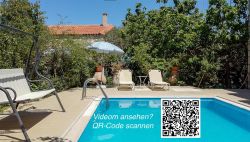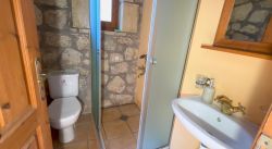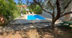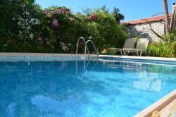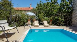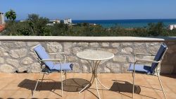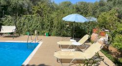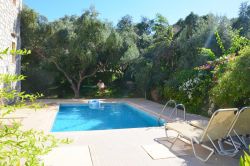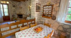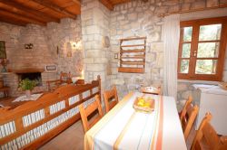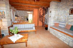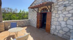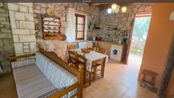 Das Haus wirkt sehr gemütlich durch die Kombination von Holz und Naturstein. Das Haus Stelo verfügt über 1 Wohn-Essbereich mit Schlafsofa ,Fernseher, Kamin und Klimaanlage. Die Küche ist im Wohnraum integriert.Über eine Wendeltreppe gelangt man zum im Obergeschoß liegenden Doppelschlafzimmer und Badezimmer mit Dusche. Auf der Dachterrasse befinden sich Gartenmöbel. Von dort aus hat man einen hervorragenden Ausblick auf die Landschaft und die Umgebung,bis zum Meer. Die Terrasse im Erdgeschoss ist ebenfalls mit Aussenmobiliar ausgestattet und eingebettet in einem Garten. Die Büsche bieten genügend Sichtschutz zur Nachbarvilla. Am Pool sind Sonnenliegen vorhanden.