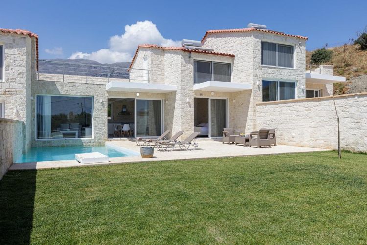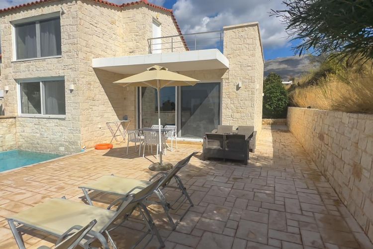 Die Villa verfügt über eine große Terrasse mit Meerblick. Sie hat einen Pool und Wlan, A/C Klima und TV